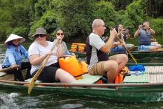 13.30: Visit Tam Coc by a small boat rowed by a local for about 2 hours. Known as “Halong Bay on land”, Tam Coc is the name of the limestone caves area stretching along Ngo Dong river. The boat trip is a nice journey along the river with the peaceful scenery of Limestone Mountains, rice paddy and the sight of some temples along the way. If traveling during harvest season, you may have chances to see the yellow rice carpet along the river banks.